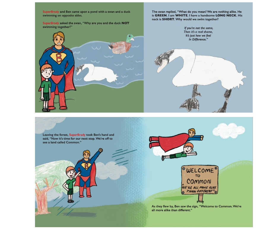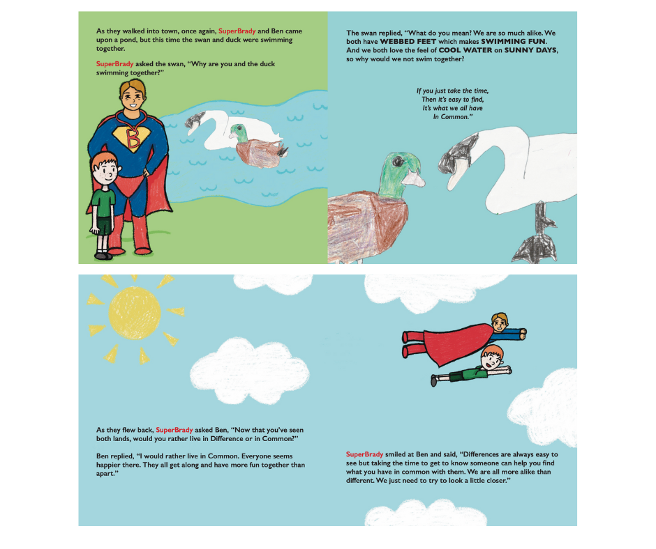 In Common follows the journey of SuperBrady and a young boy named Ben as they travel to the land of Difference and the land of Common. SuperBrady and Ben meet the many inhabitants of these lands and observe the relationships they share. As their journey unfolds, SuperBrady helps Ben learn an important lesson that though it's easy to see how someone is different than you, it's more fun to take the time to discover what you might have in common with them. No matter a person's ability, gender, race, or where they live, we all are more alike than different.