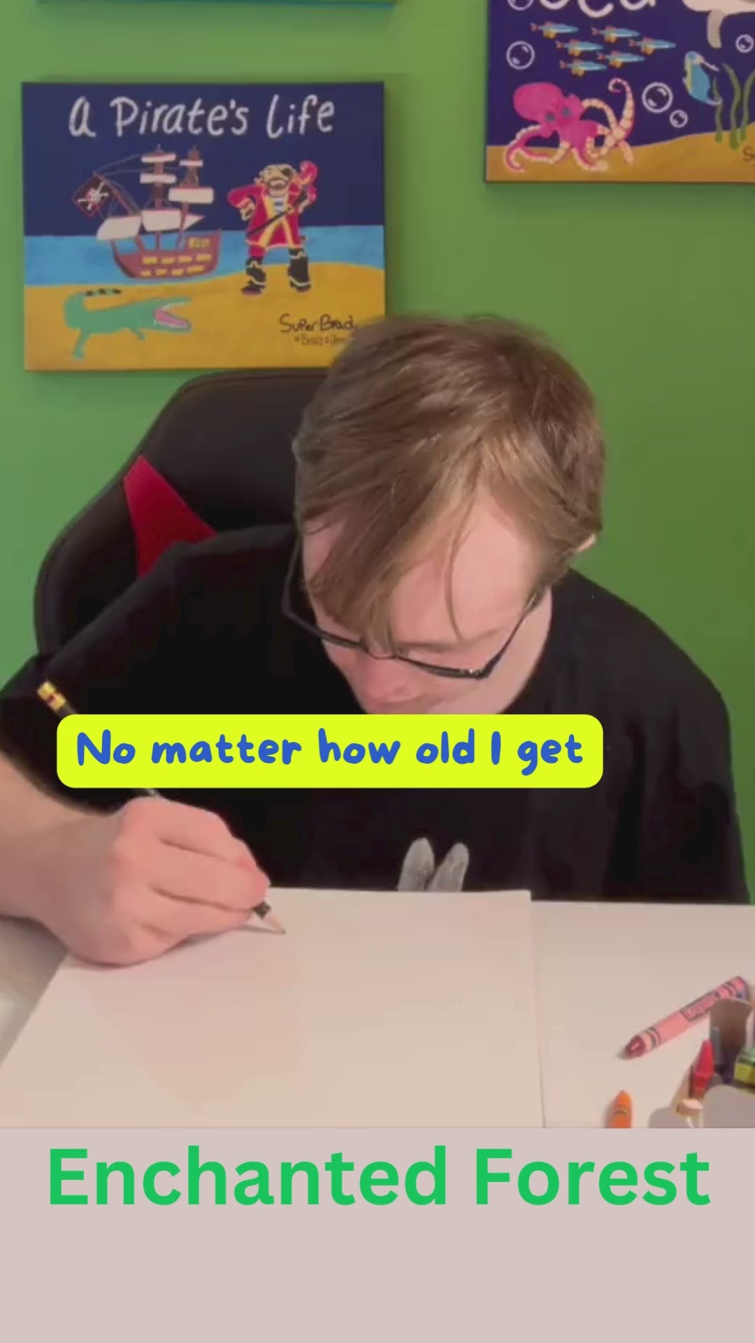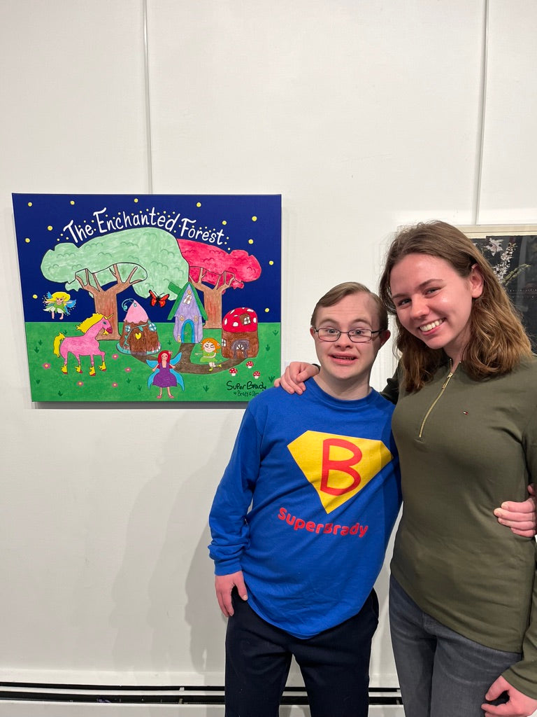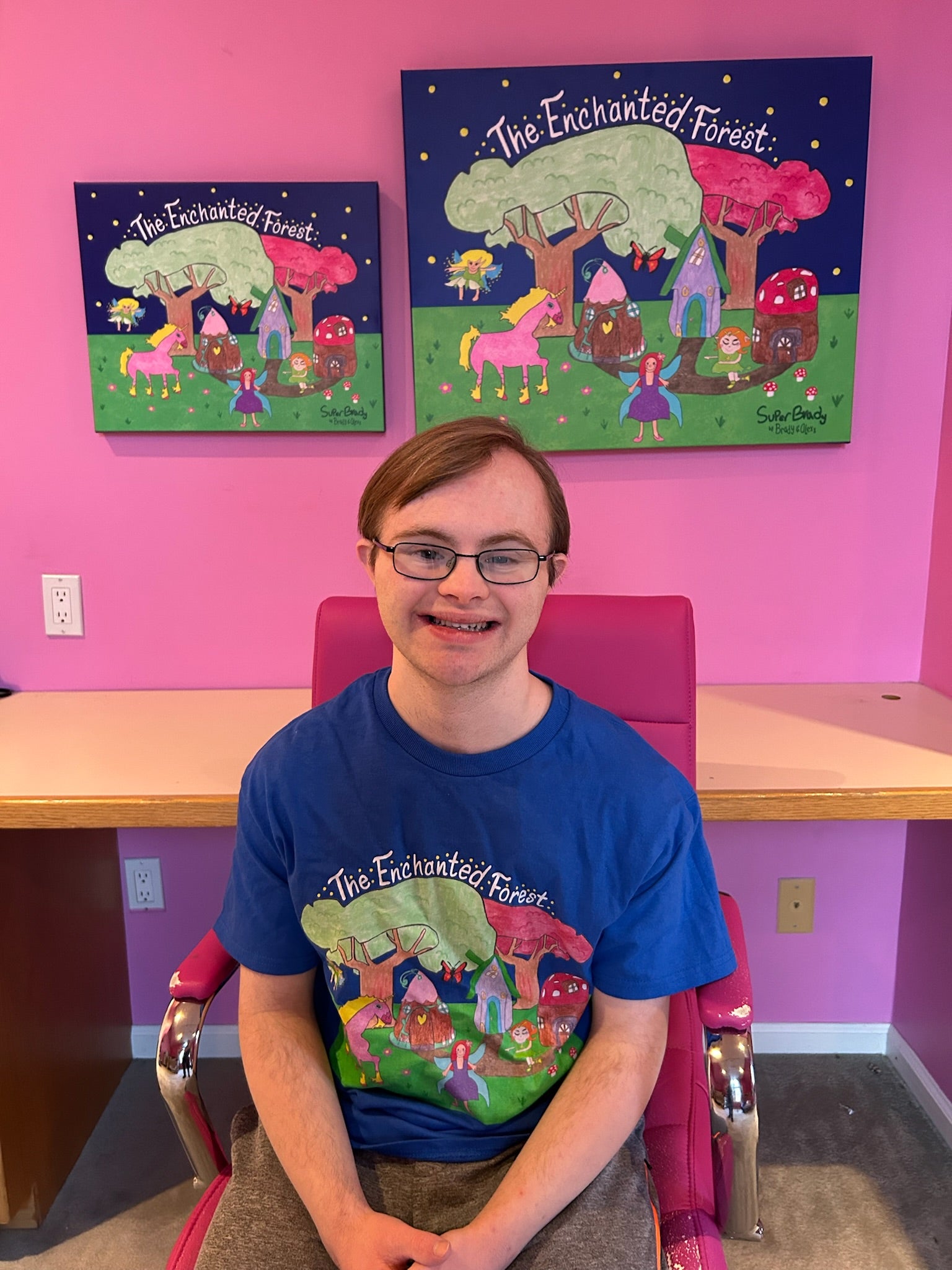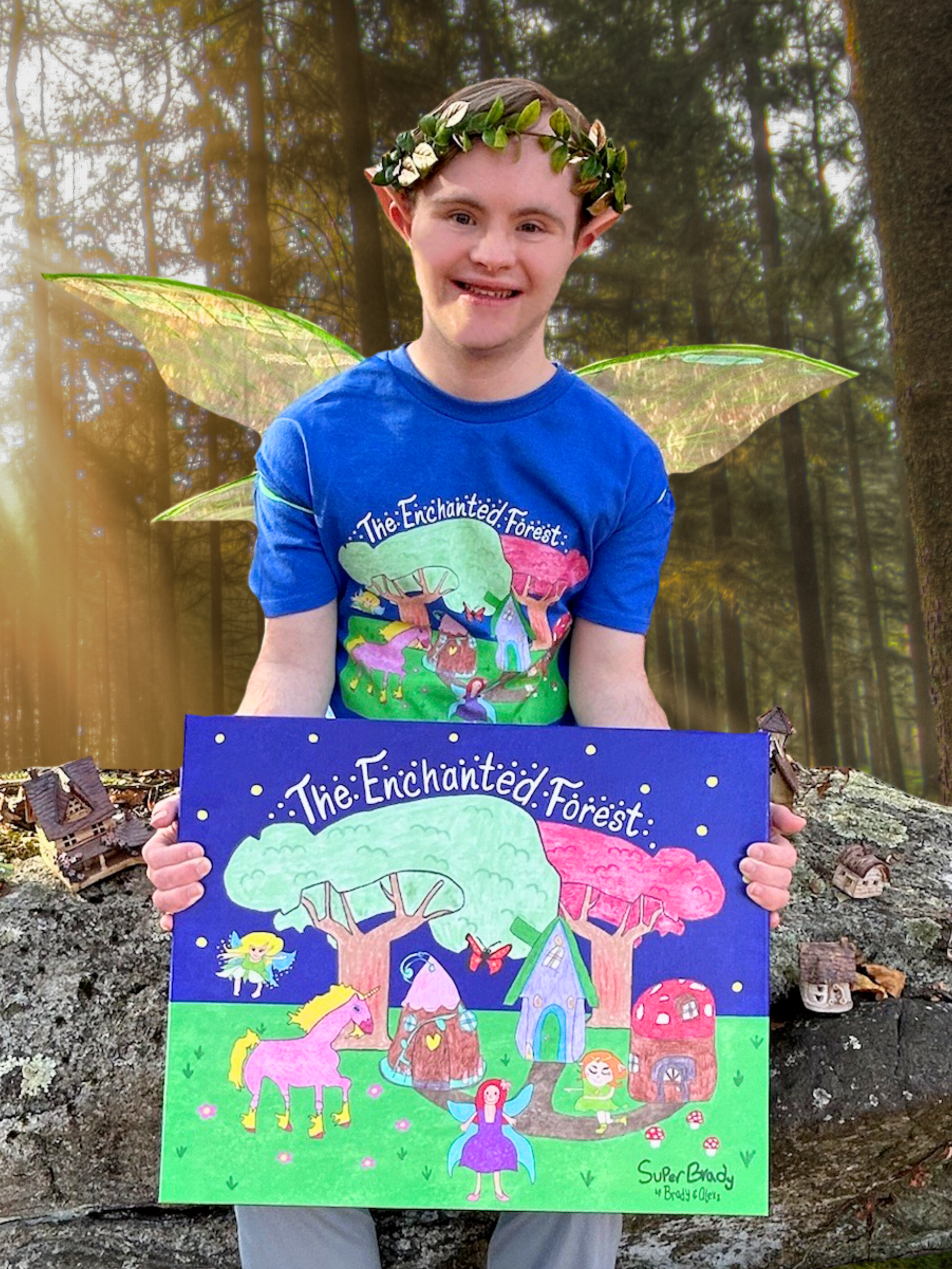 Take a walk through The Enchanted Forest. Brady's hand-drawn forest, forest elf, unicorn, butterfly, fairies, and fairy houses are combined digitally by his sister, Alexx, to create this magical Enchanted Forest scene. Perfect for displaying on your child's wall to bring fun and vibrancy to any room.