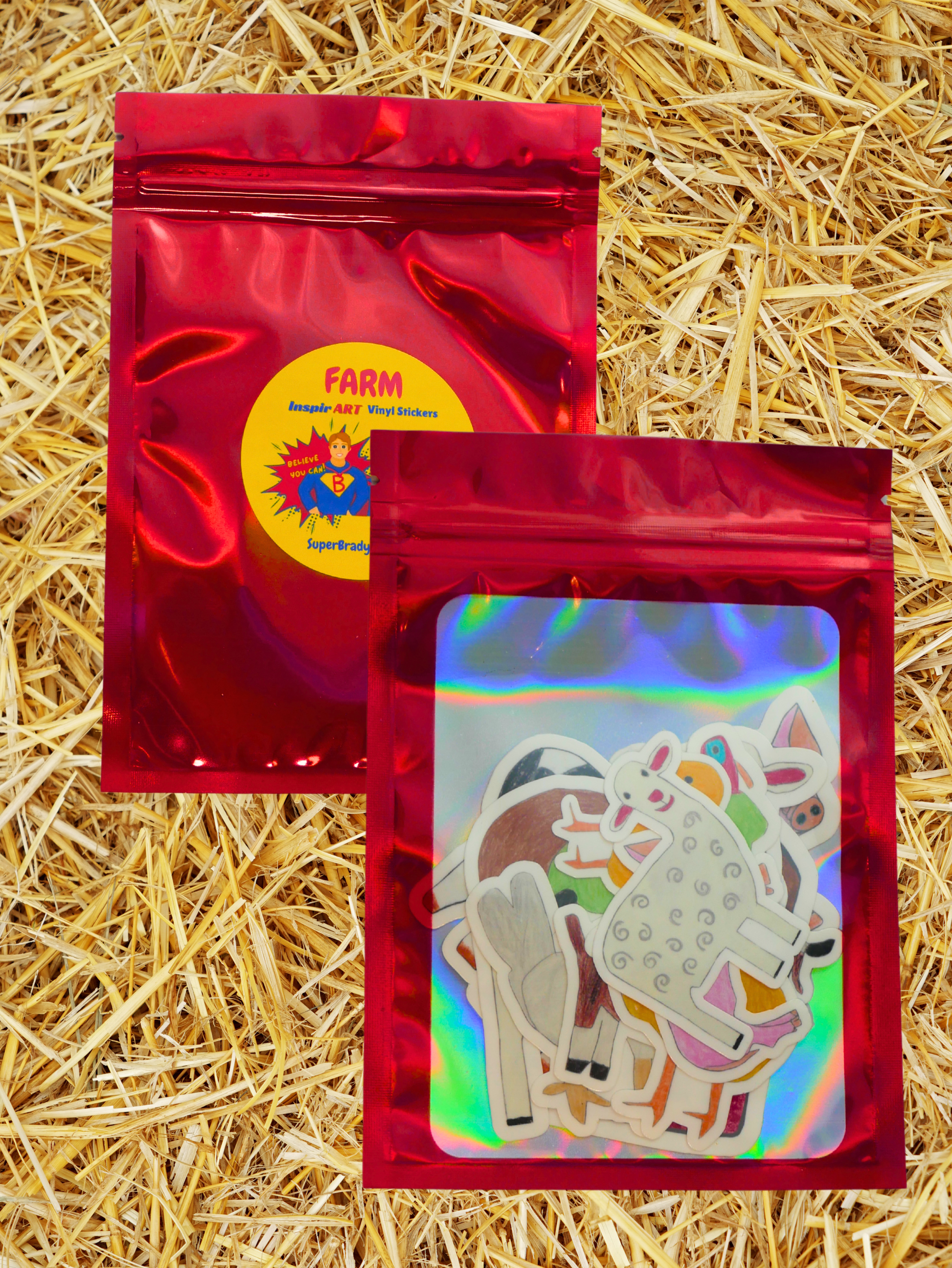 11 Farm-themed, vinyl premium glossy stickers. Various sizes 2"-3". Each sticker is personally created from hand-drawn InspirART by Brady. Bonus SuperBrady sticker included.