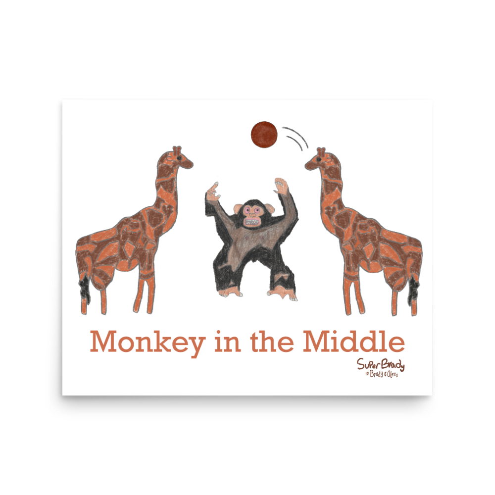 Monkey in the Middle is an age-old game played on playgrounds and in backyards. Brady, a young man with Down syndrome, drew these stately giraffes and funny monkey, freeform with pencil and crayon. His younger sister, Alexx, helped him create the whimsical playground theme. Printed from Brady's original color drawings.
