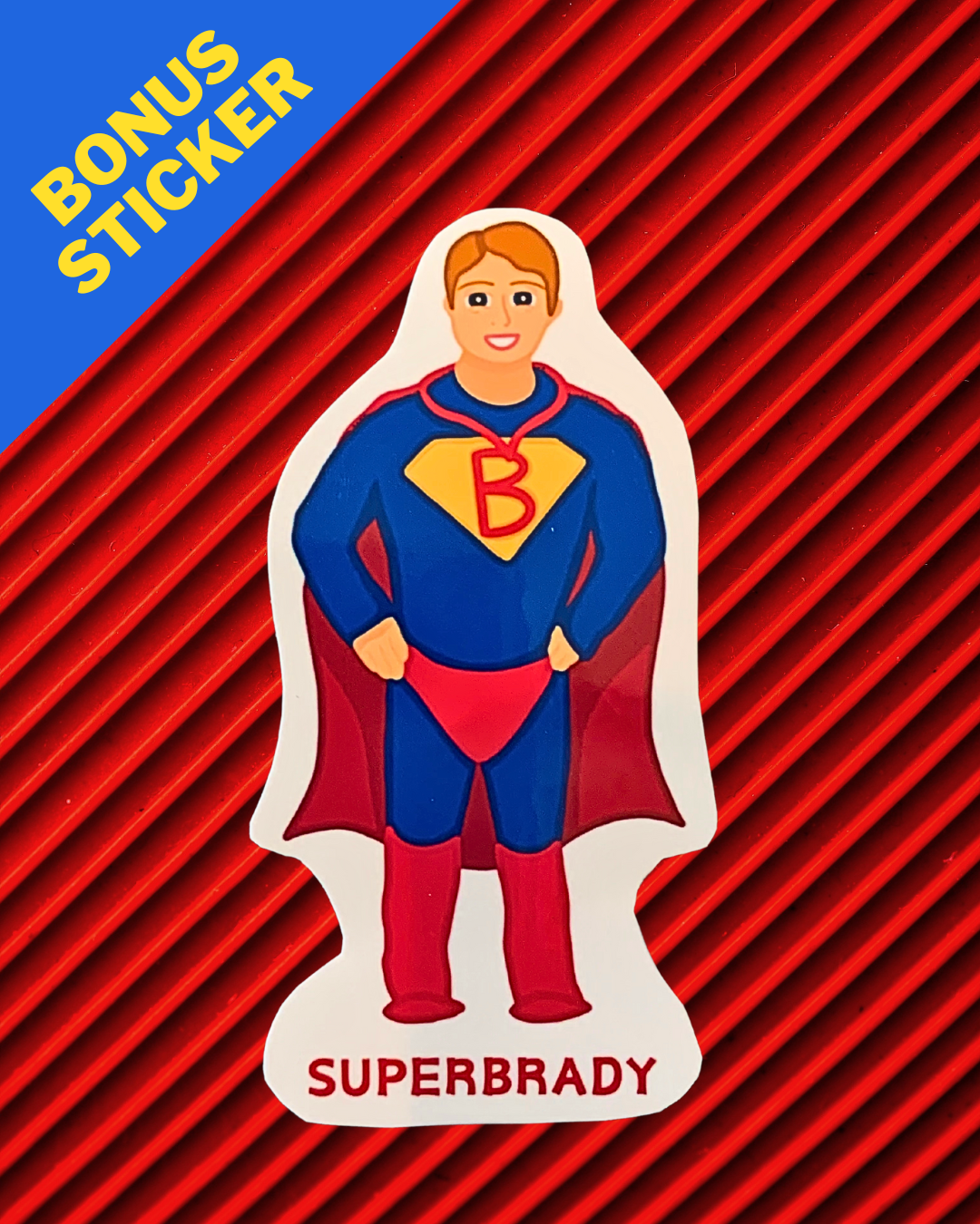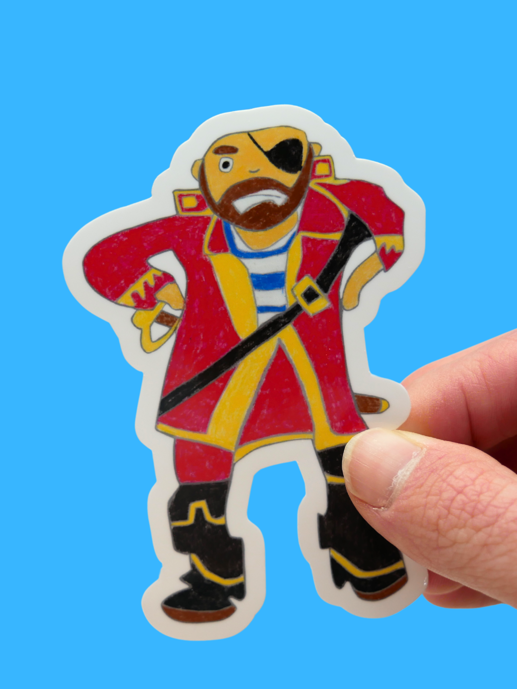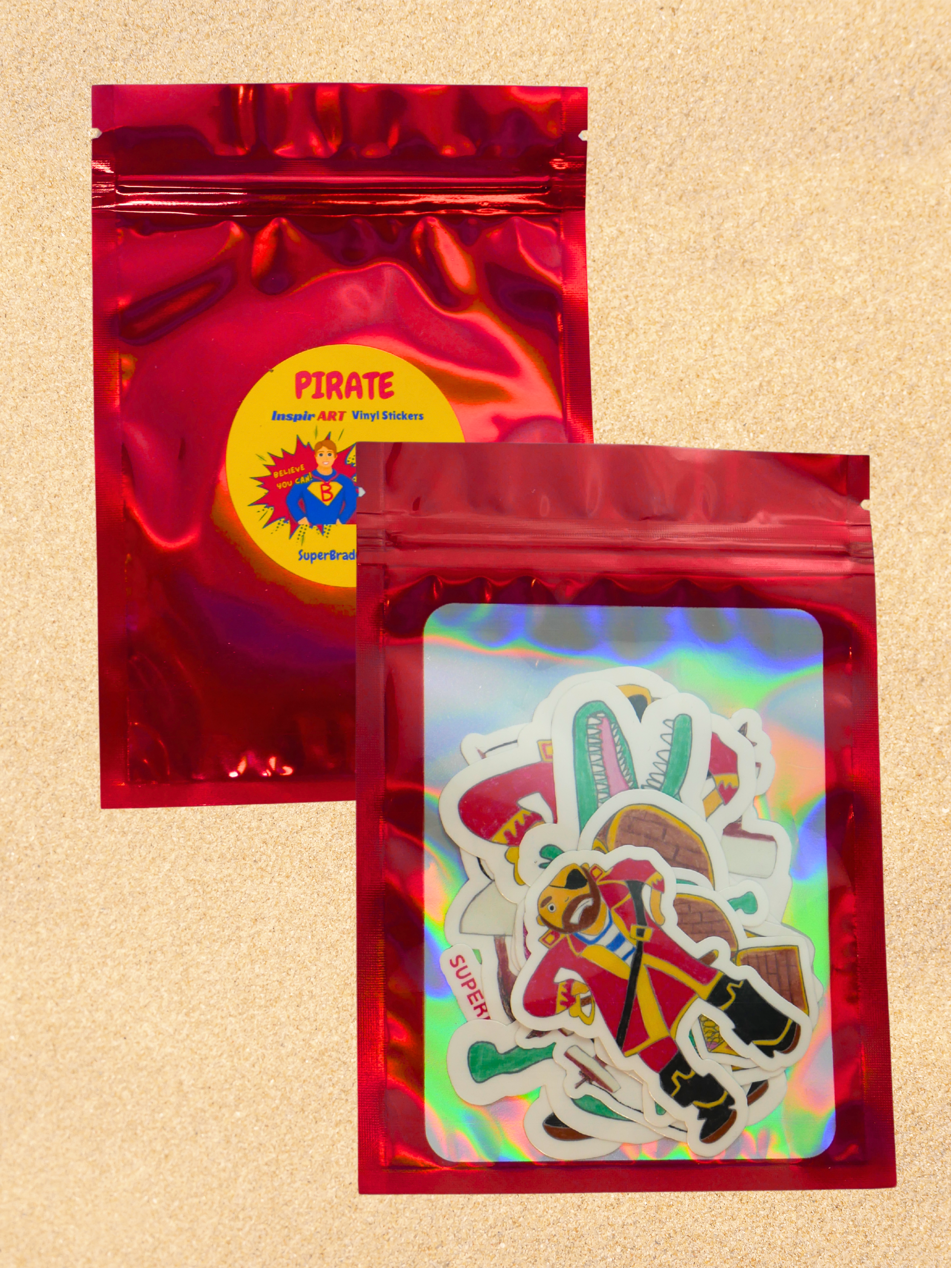 9 Pirate-themed, vinyl premium glossy stickers. Various sizes 2"-3". Each sticker is personally created from hand-drawn InspirART by Brady. Includes one bonus SuperBrady Sticker.