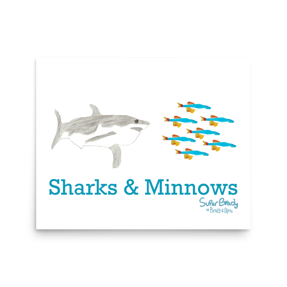You may remember Sharks and Minnows as an interactive playground game of tag elimination. From start to finish, no one is left out of this fun game as any "minnows" that are tagged by the "shark" then become "sharks" themselves. The last "minnow" remaining wins! Brady, a young man with Down syndrome, drew these colorful minnows and playful shark, freeform with pencil and crayons. His younger sister, Alexx, helped him create the whimsical playground theme. Printed from Brady's original color drawings.