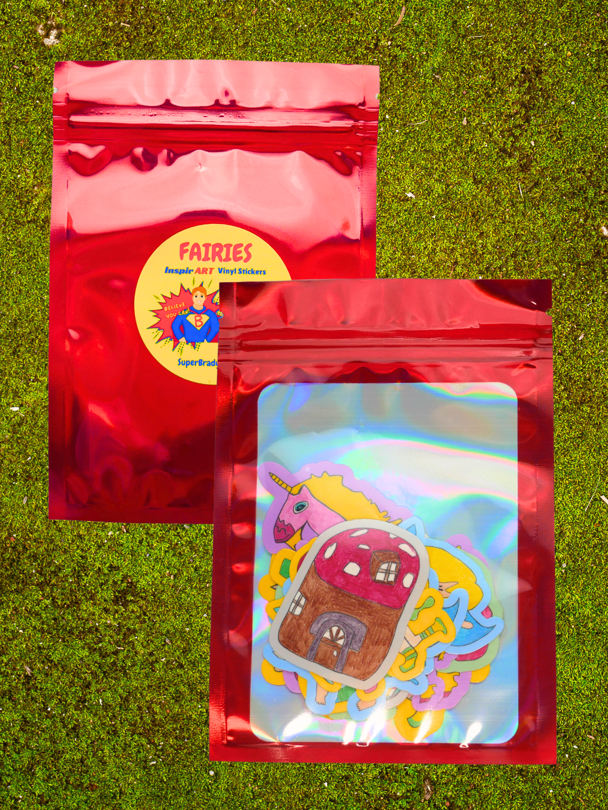 11 Fairy Forest-themed, vinyl premium glossy stickers. Various sizes 2"-3". Each sticker is personally created from hand-drawn InspirART by Brady. Bonus SuperBrady Sticker included.